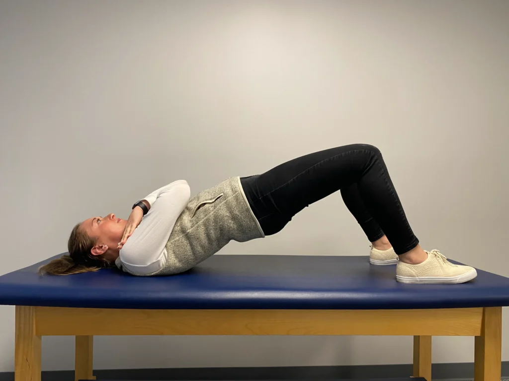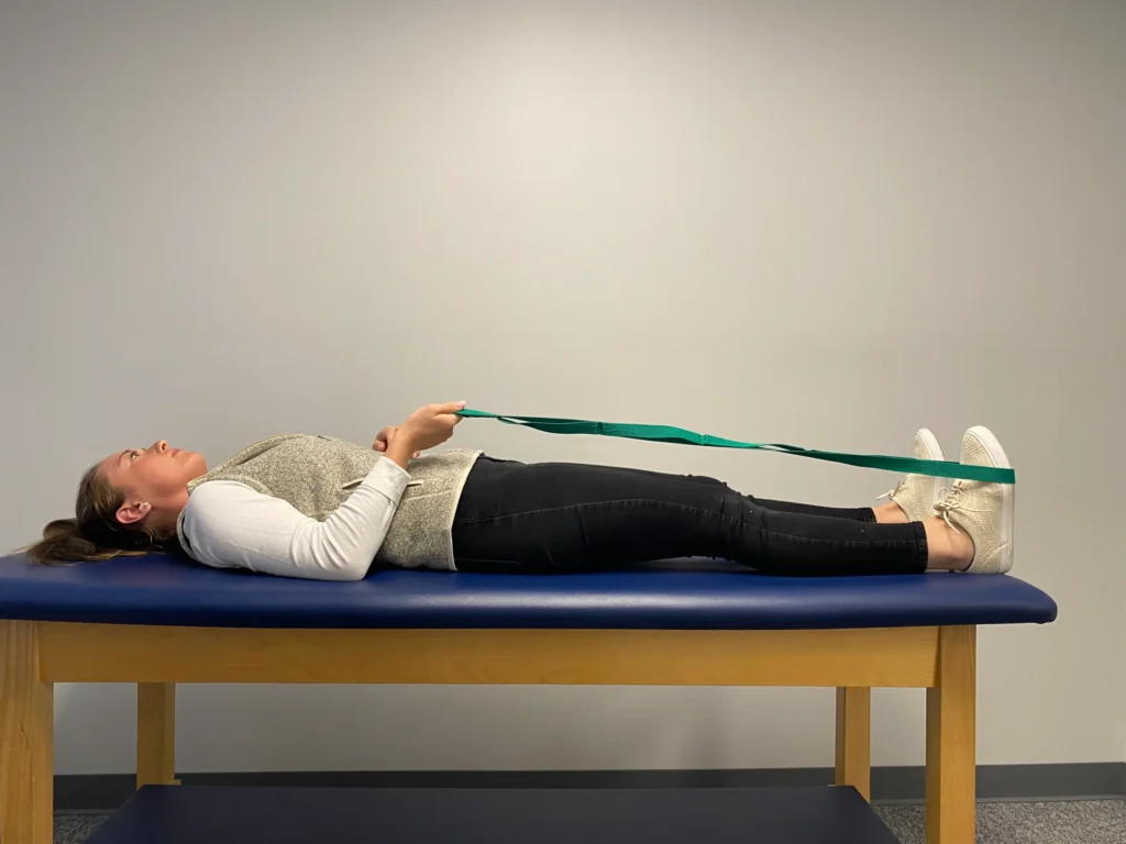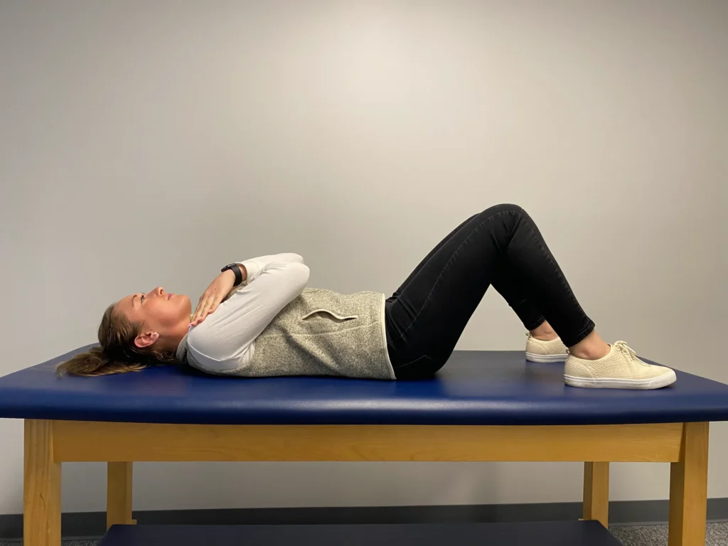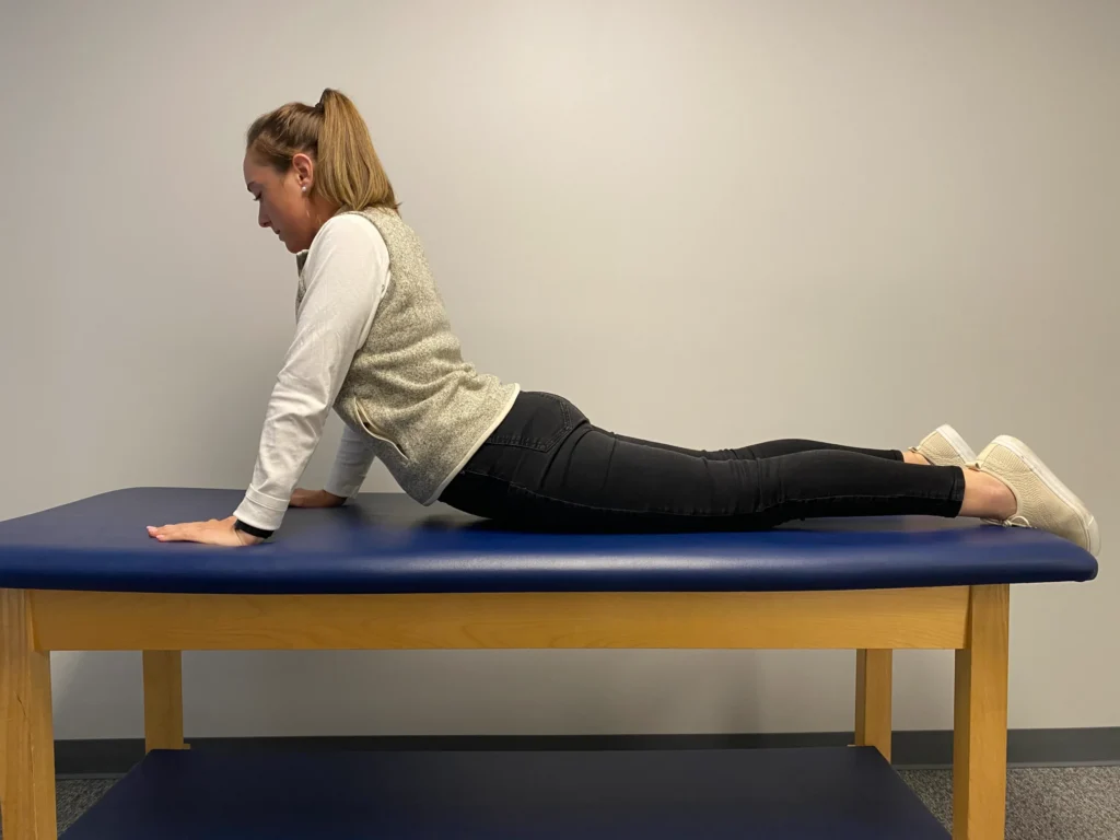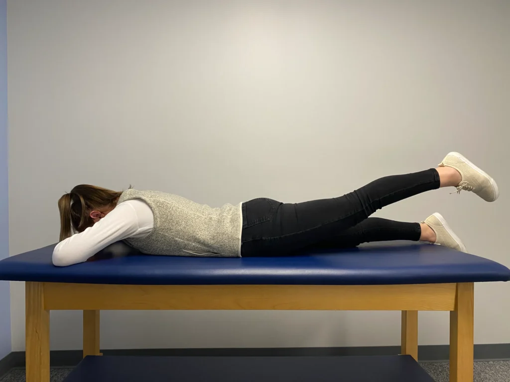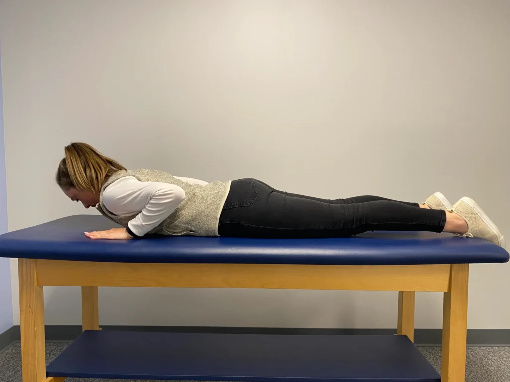 • Lie on your stomach, keeping your knees straight and supporting your forehead on your hands to maintain a neutral spine position
