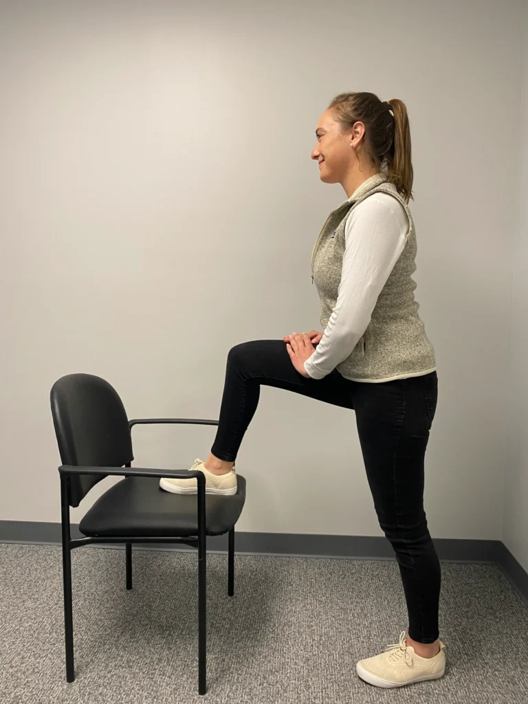 • Stand up straight and place your right foot on a raised surface in front of you, with your toes facing forward