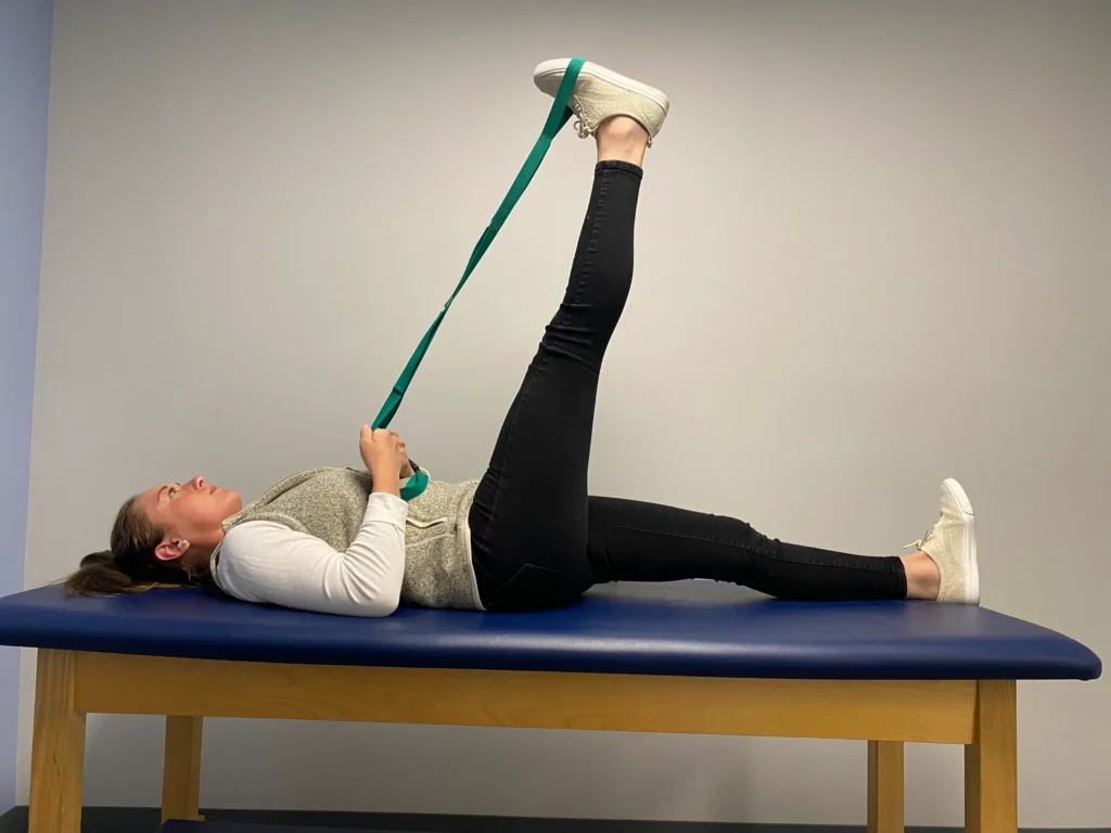 • Using your upper body, raise the leg off the floor, keeping the leg straight until you feel a gentle stretch in the back of the leg