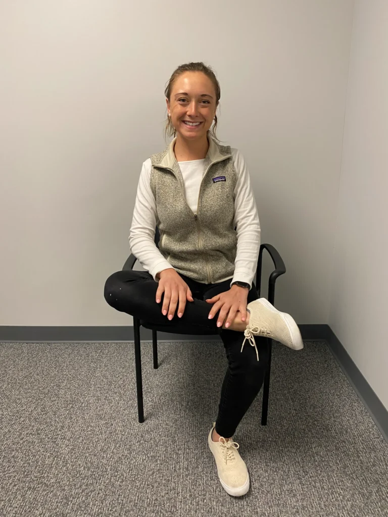 • Sit up straight at the edge of a chair with one ankle resting on the opposite knee