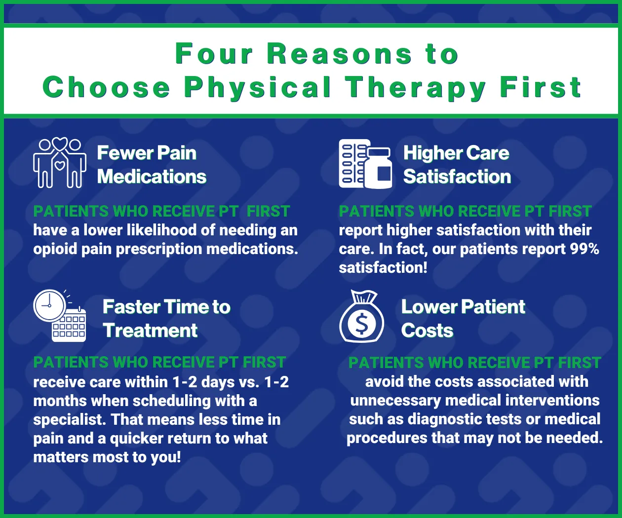 But there’s another option: start with physical therapy. It provides safe, effective relief sooner — helping you feel better, avoid unnecessary procedures, and reduce dependence on medication.