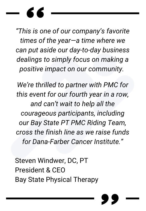 “This is one of our company’s favorite times of the year—a time where we can put aside our day-to-day business dealings to simply focus on making a positive impact on our community,” says President & CEO, Steven Windwer, PT, DC. “We’re thrilled to partner with PMC for this event for our fourth year in a row, and can’t wait to help all the courageous participants, including our Bay State PT PMC Riding Team, cross the finish line as we raise funds for Dana-Farber Cancer Institute.”
